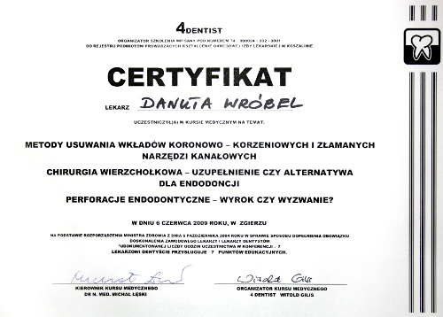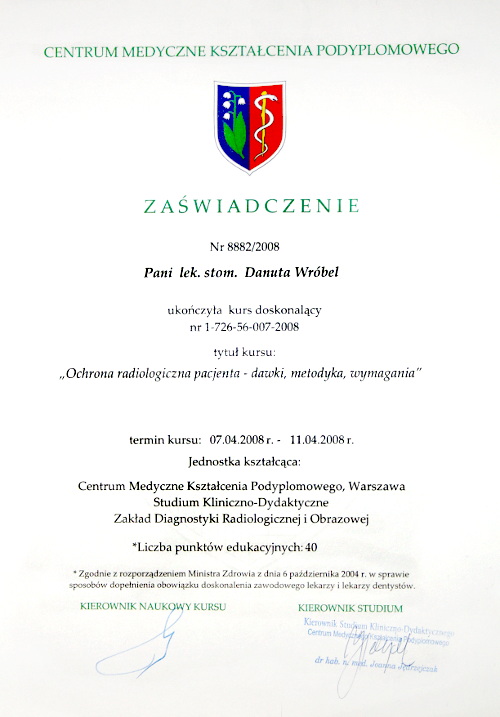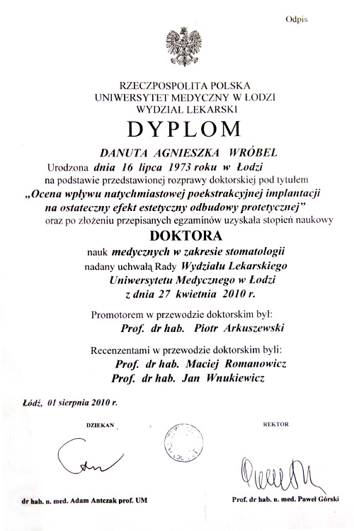 Dr. Wróbel obtained her medical license in 2000. In 2010, by decision of the Faculty of Medicine of the Medical University of Łódź, she earned her PhD in medical sciences. Since then, she has been continuously improving her qualifications and developing her professional skills. Her work is characterized by professionalism, vast knowledge, patience, and an individual, warm approach to each patient. These qualities are also passed on to the other doctors in the clinic. They are confirmed by numerous patient reviews on medical forums as well as by the certificates and distinctions received, such as:
